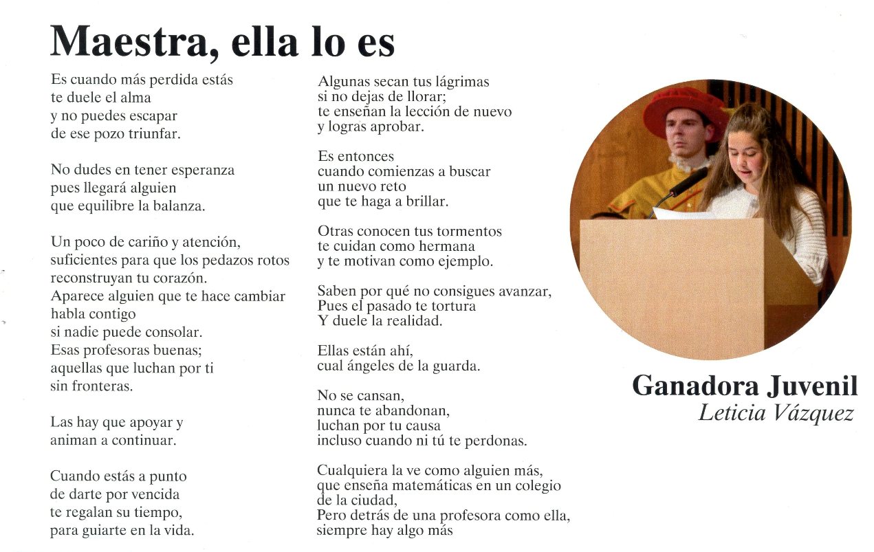 Tan pronto como nos sea posible les facilitaremos imágenes y les completaremos la información sobre el poema ganador en categoría Senior, su autora y, en general, sobre el desarrollo de este brillante acto que, conducido por el Caballero Electo D. Manuel Viso, tuvo como Mantenedor al concejal de Cultura D. José Manuel Sande y contó con la participación de destacadas personalidades del mundo de la cultura, incluyendo la actuación musical del Coro del la Sagrada Familia.