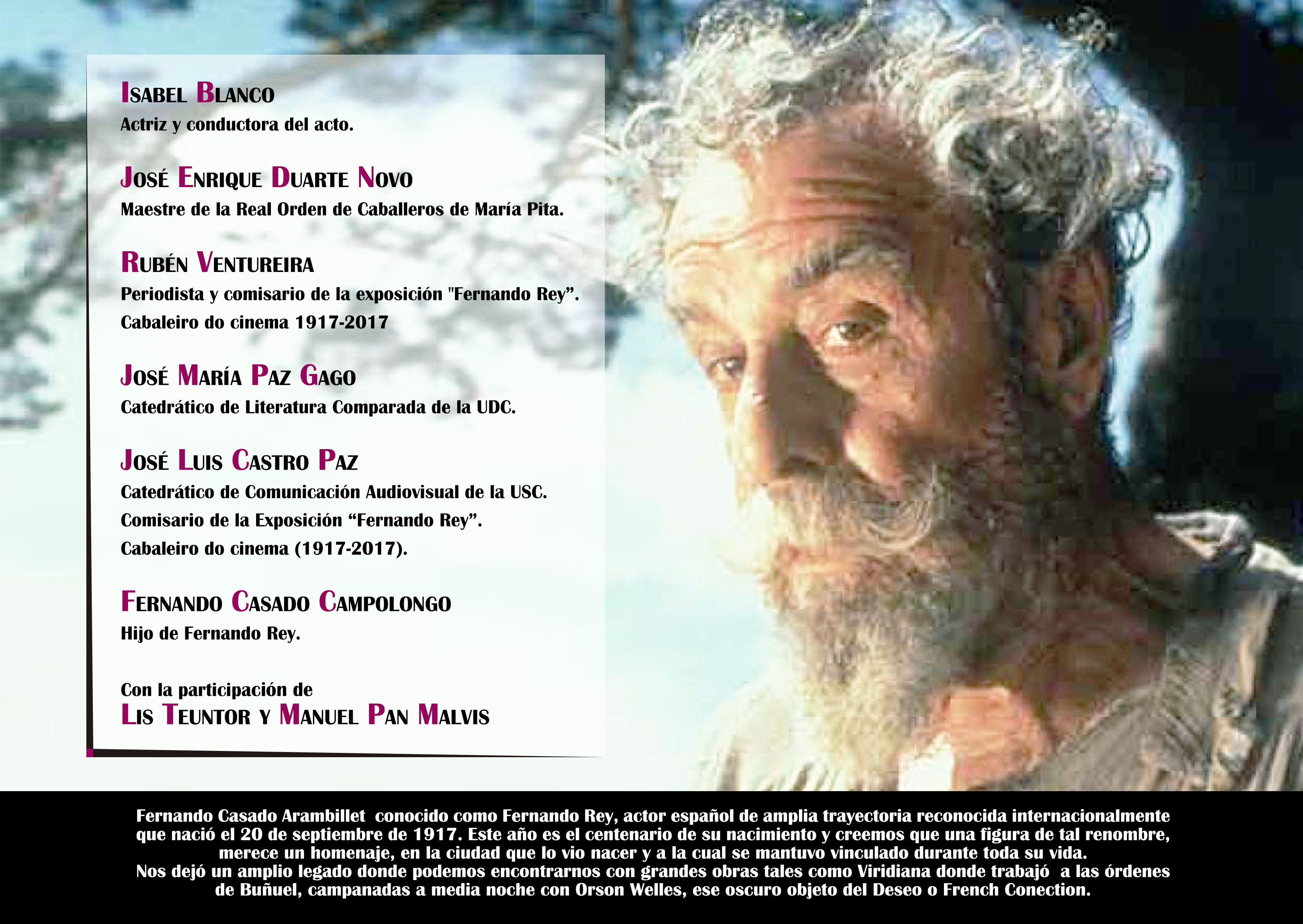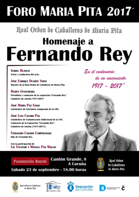 El pasado 23 de septiembre a las 18:00 h. en la Fundación Barrié (Cantón Grande, 9) la Real Orden de Caballeros de María Pita le rindió un homenaje a Fernando Rey en el centenario de su nacimiento en nuestra Ciudad.