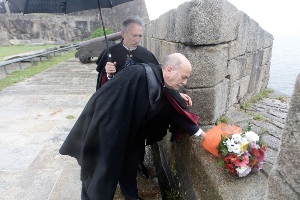 Tras depositar una corona ante la cruz de los Caídos, situada para este acto en un lateral del Ayuntamiento, el Maestre de la OCMP, el Almirante Bolíbar Piñeiro y el Alcalde -Gran Maestre de la OCMP- pronunciaron unas vibrantes alocuciones.