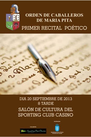 Desde hace 20 años, la Orden de Caballeros de María Pita incluye entre sus actividades habituales la organización con carácter anual de los Juegos Florales. Los poemas premiados a lo largo de estos años constituyen un patrimonio cultural que nuestra Orden desea dar a conocer al público y para ello se ha propuesto la organización de varios recitales poético-musicales, el primero de los cuales se ha celebrado el viernes 20 de setiembre a las 20:00h. en el Salón de Cultura del Sporting Club Casino de nuestra Ciudad.