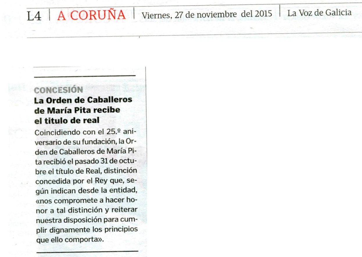 Bienvenidos a la web de esta Muy Noble y Muy Leal Orden de Caballeros que, fundada en 1990, lleva con orgullo desde el año 2015 el título de Real concedido por Su Majestad el Rey Felipe VI. A través de sus páginas podrán informarse sobre nuestra historia, nuestros quehaceres, presentes y futuros, y nuestros desvelos por exaltar la gesta de María Pita, nuestra heroína.