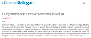 La Real Orden de Caballeros de María Pita realizó en la tarde del viernes 11 de agosto, la etapa inicial del recorrido del Camino Inglés arrancando desde la iglesia de Santiago, en la Ciudad Vieja de La Coruña.