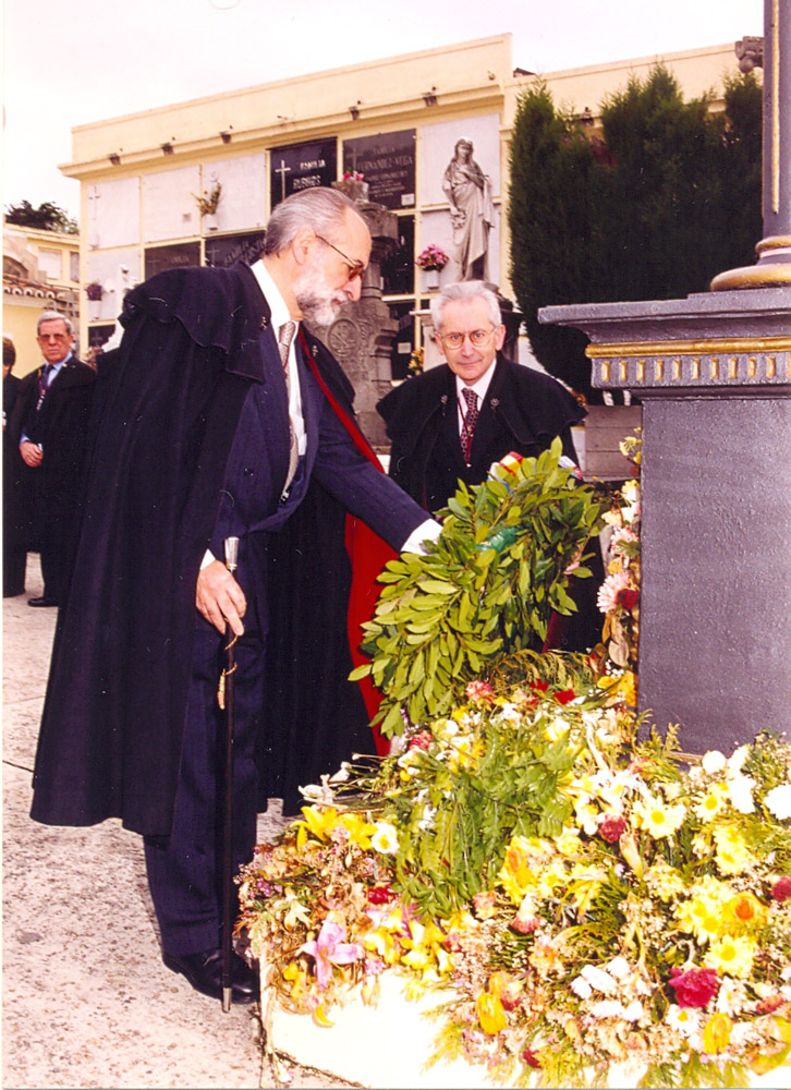 El Maestre Gundín y el Caballero Iglesias Martelo colocan la ofrenda floral ante la Cruz de los Olvidados en el Cementerio de San Amaro |