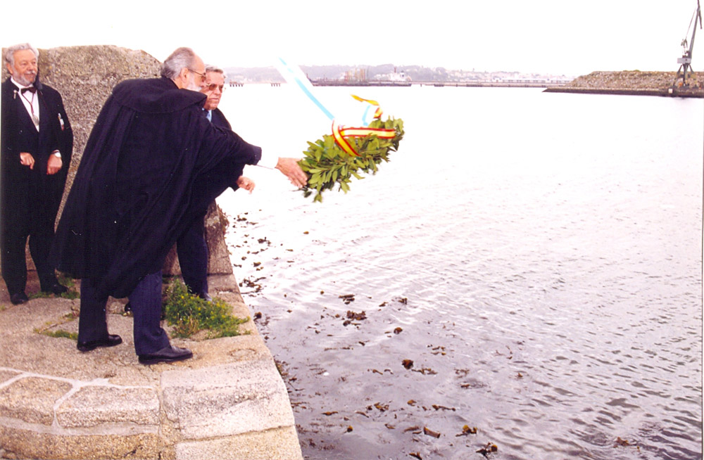 El Caballero Alcázar Bermejo, oferente del acto a la memoria de los héroes caídos en la defensa de La Coruña contra los invasores británicos en 1589, ayudado por el Maestre, deposita una corona de laurel en aguas de la bahía, desde la muralla del castillo de San Antón. |