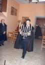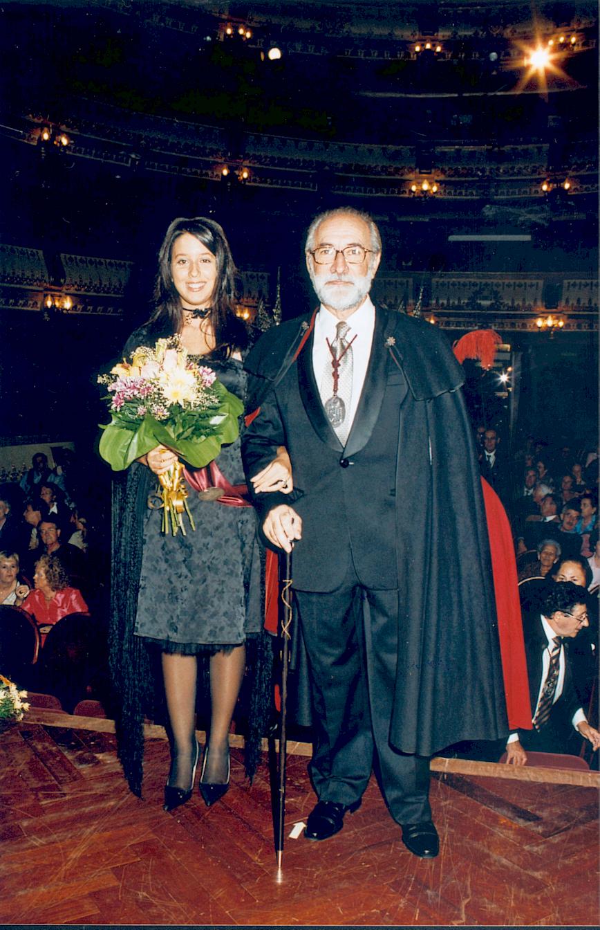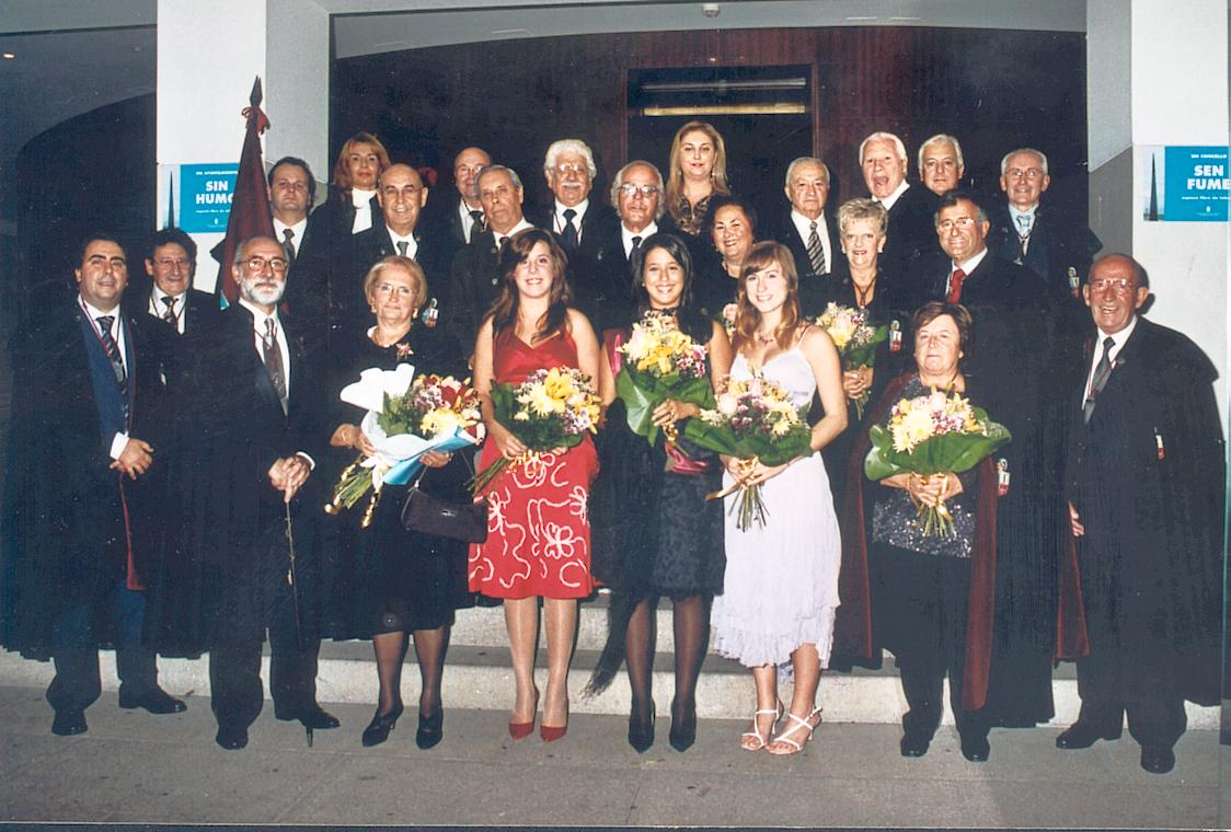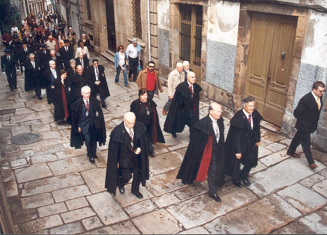 En el Teatro Rosalía de Castro, tras los alabarderos de los Tercios que abren la marcha, la actual Condesa de Pardo Bazán, la Ilma. Sra. Dª Carmen Colmeiro Rojo, preside la comitiva, yendo acompañada por el Canciller Rodríguez Maneiro. |