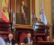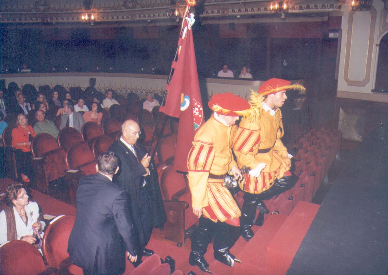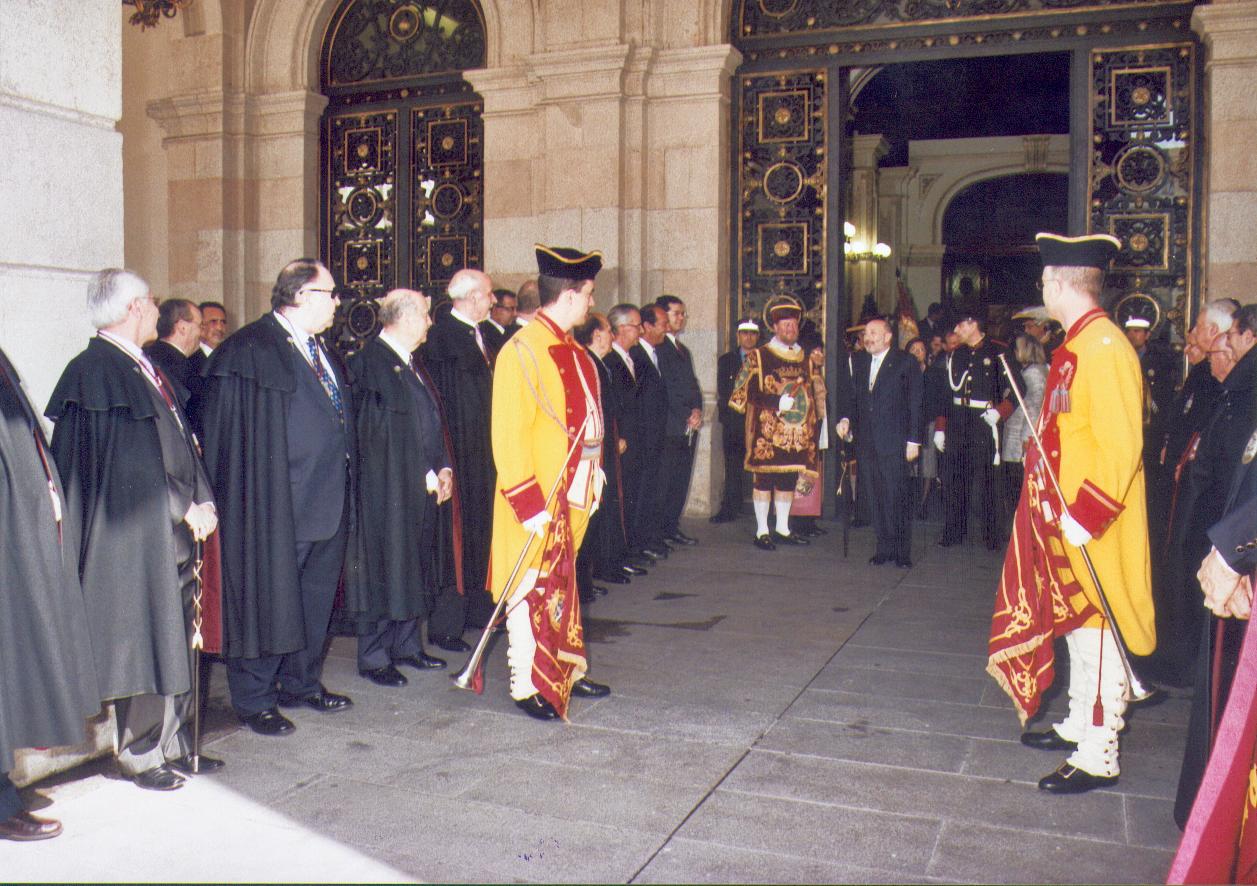 El nuevo Caballero de Honor accede al Salón de Sesiones del palacio Municipal acompañado por el Maestre Iglesias Martelo y el Gran Maestre, el Alcalde Losada de Aspiazu. |
