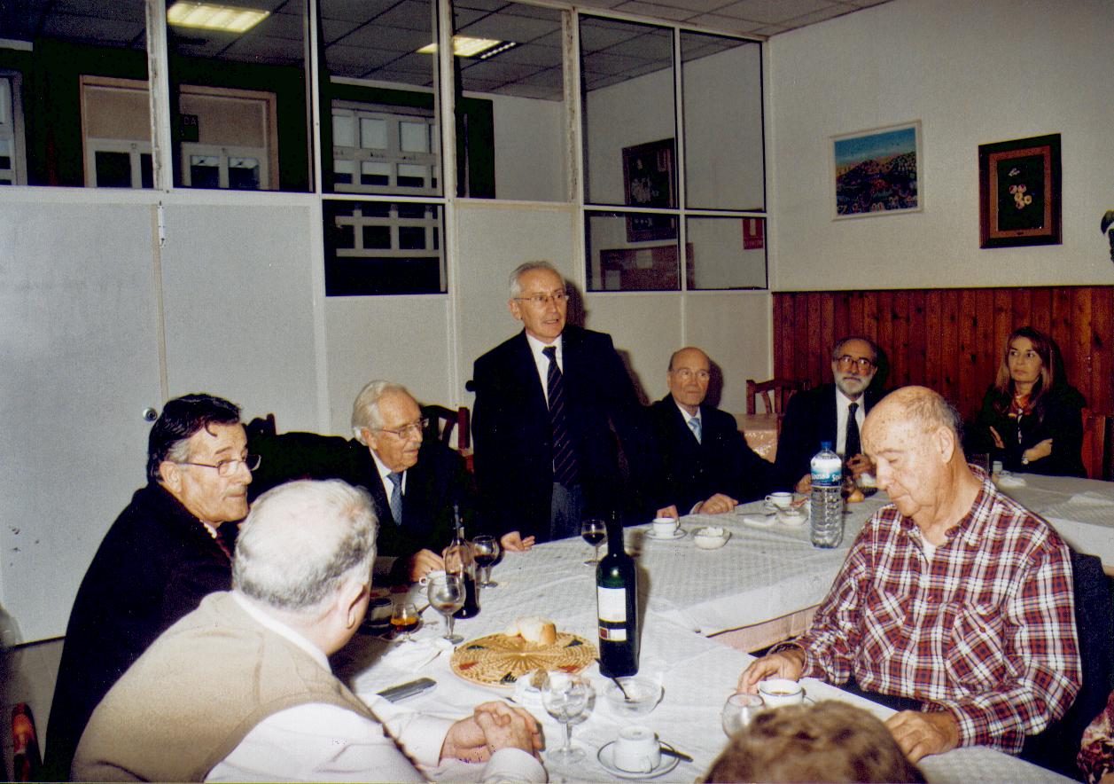 Rodrigo presidiendo la mesa. Ojo, aunque parece durmiendo, de eso nada; atento a todo. Le acompaña su sobrino que le ayuda en varias ocasiones aclarándole conceptos que no ha oído bien por el ruido ambiente. A su derecha el presidente del Sporting Club y a la izquierda de su sobrino nuestro Maestre |