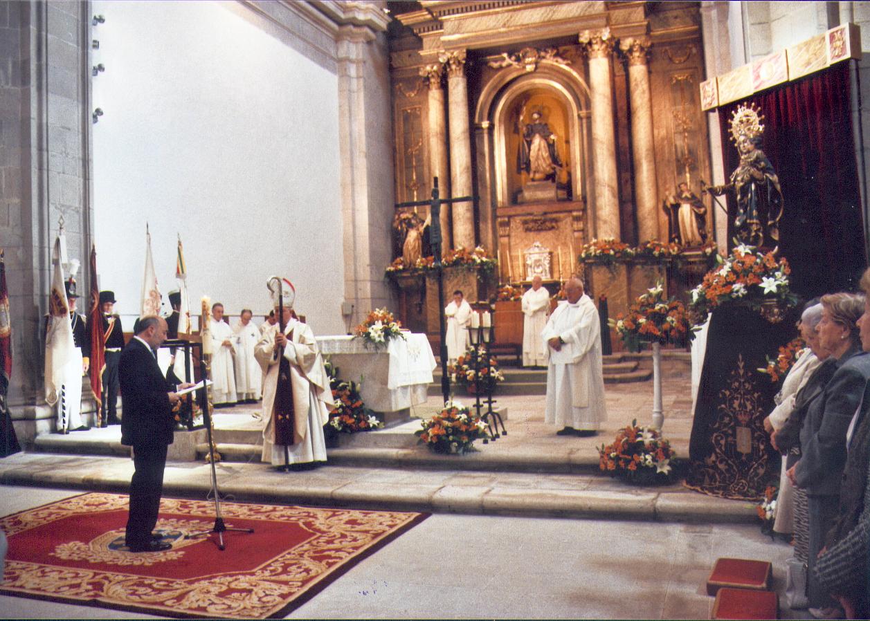 13:30 hs. En la iglesia de Sto. Domingo, en el camarín de la Virgen del Rosario, lleno a rebosar por el número de Caballeros partícipes en el acto, la Caballero María Luísa Cid Castro elevó su ofrenda a Nuestra Señora en la que incluyó el paralelismo que concurre en nuestra Ciudad: La Virgen del Rosario y María Pita juntas para defenderla. |