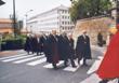 11:30 “Informalmente” formados en la plaza de Carlos I, y esperando instrucciones del Canciller –Maestro de Ceremonias en ejercicio- para acceder al Templo de la VOT e iniciar el solemne acto de Investiduras. Encabezan la formación el Lugarteniente y el Clavero y portan, respectivamente, la Espada y los Medallones de los que van a ser Investidos. |