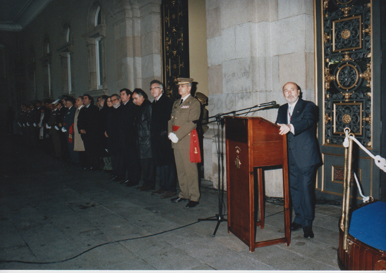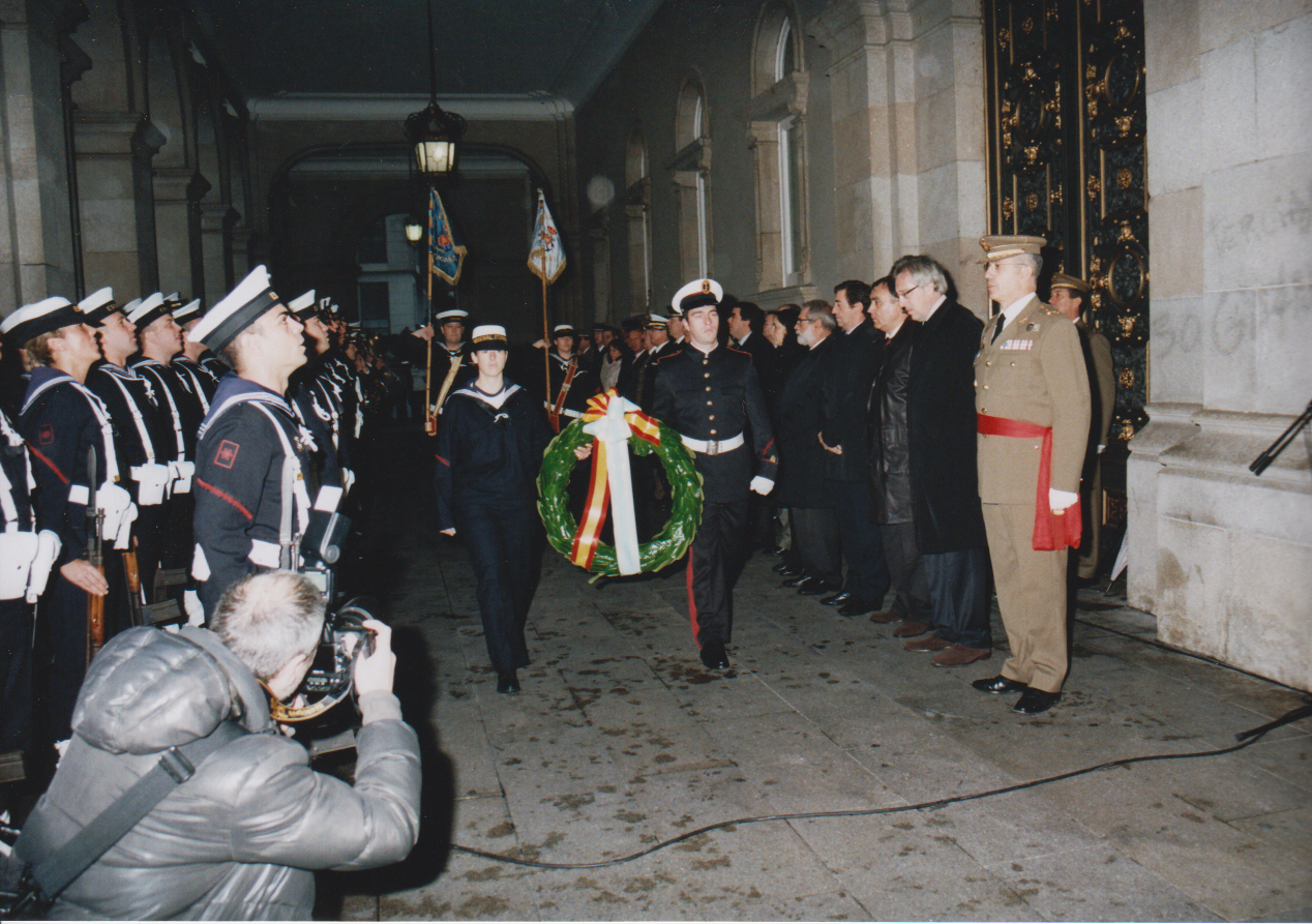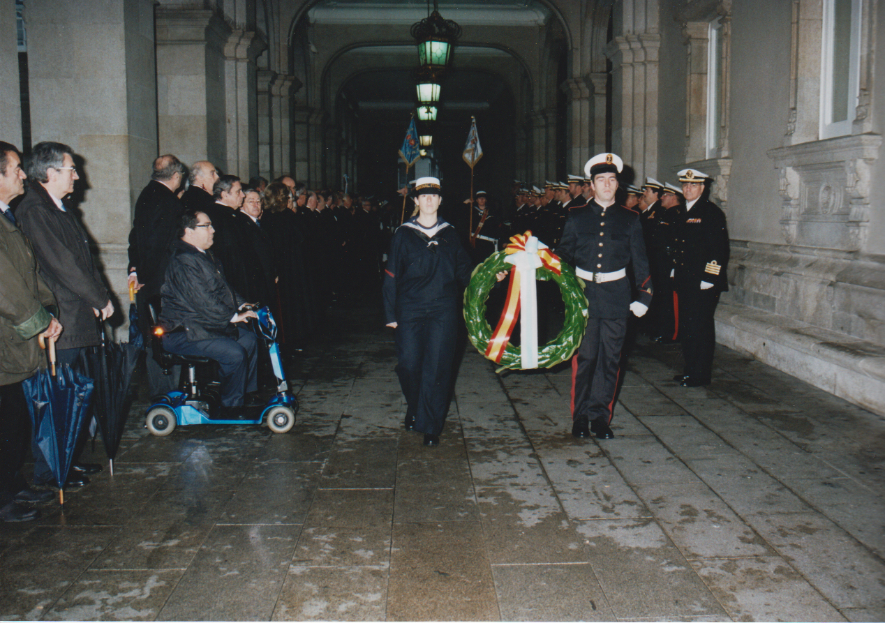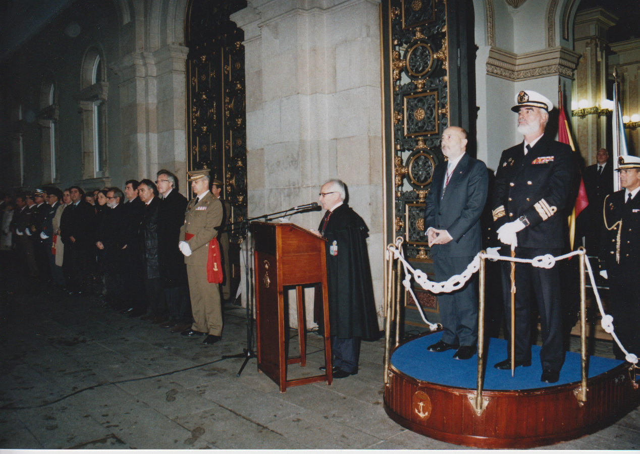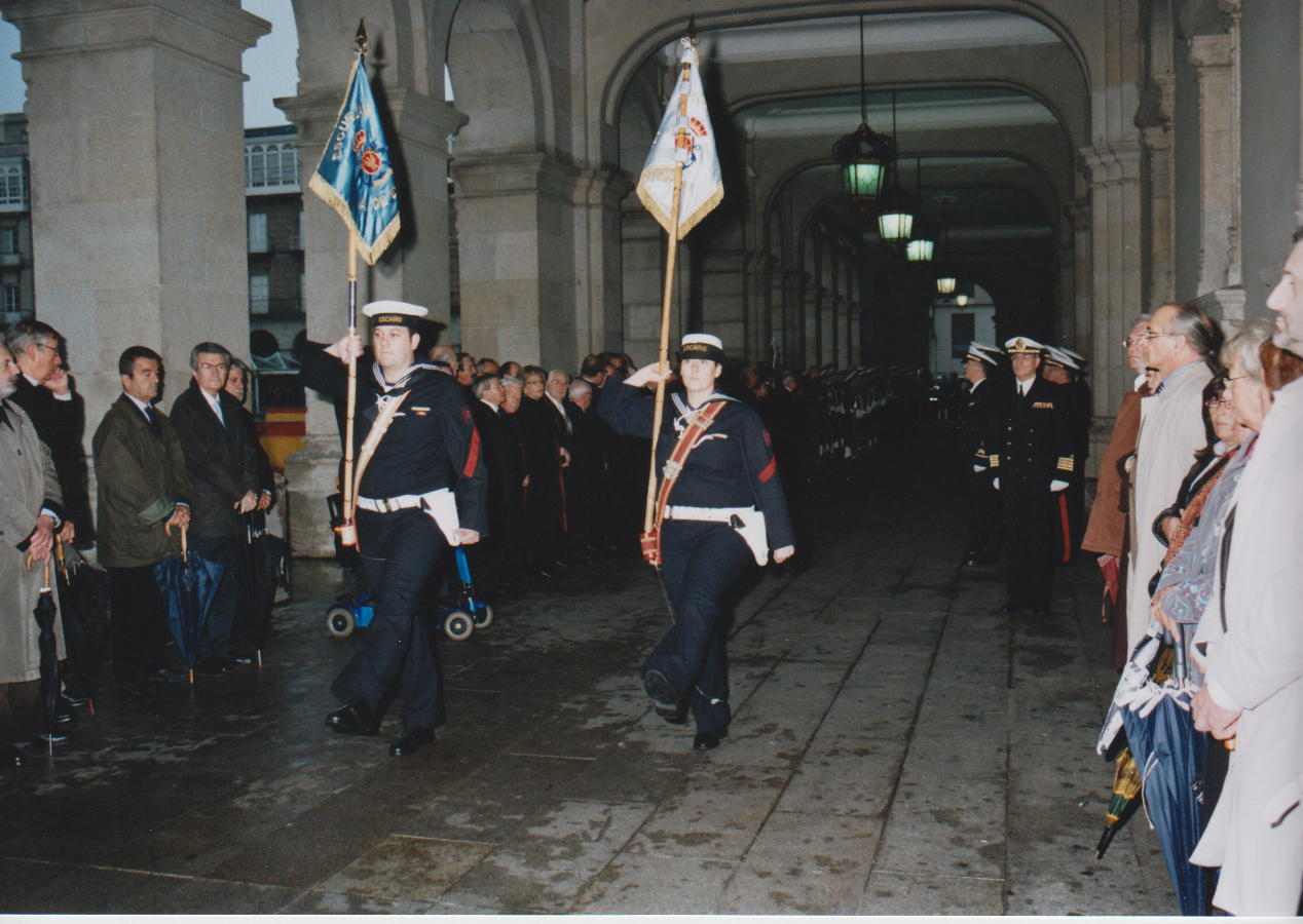 La inclemencia del tiempo obligó a que los Actos se llevaran a cabo a cubierto, en los soportales de la fachada principal del Palacio de María Pita, según el dispositivo previsto por el Arsenal para esta contingencia.