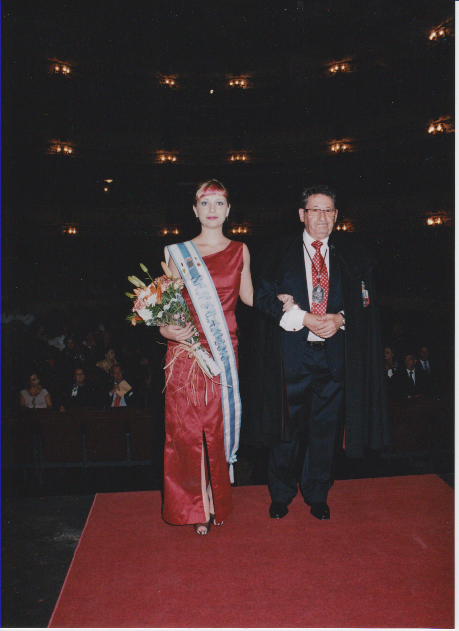 Los miembros de la Junta de Gobierno, el Mantenedor -Ilmo. Sr. Coronel D. Luís Poveda Martín- y el Maestre Iglesias Martelo acompañan a las Damas de Honor de las Hogueras de S. Juan y a su Meiga Mayor a sus sillones en el escenario. |