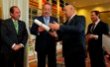 El Caballero de Honor recibe la Placa que le entrega el Maestre Vilasánchez... |