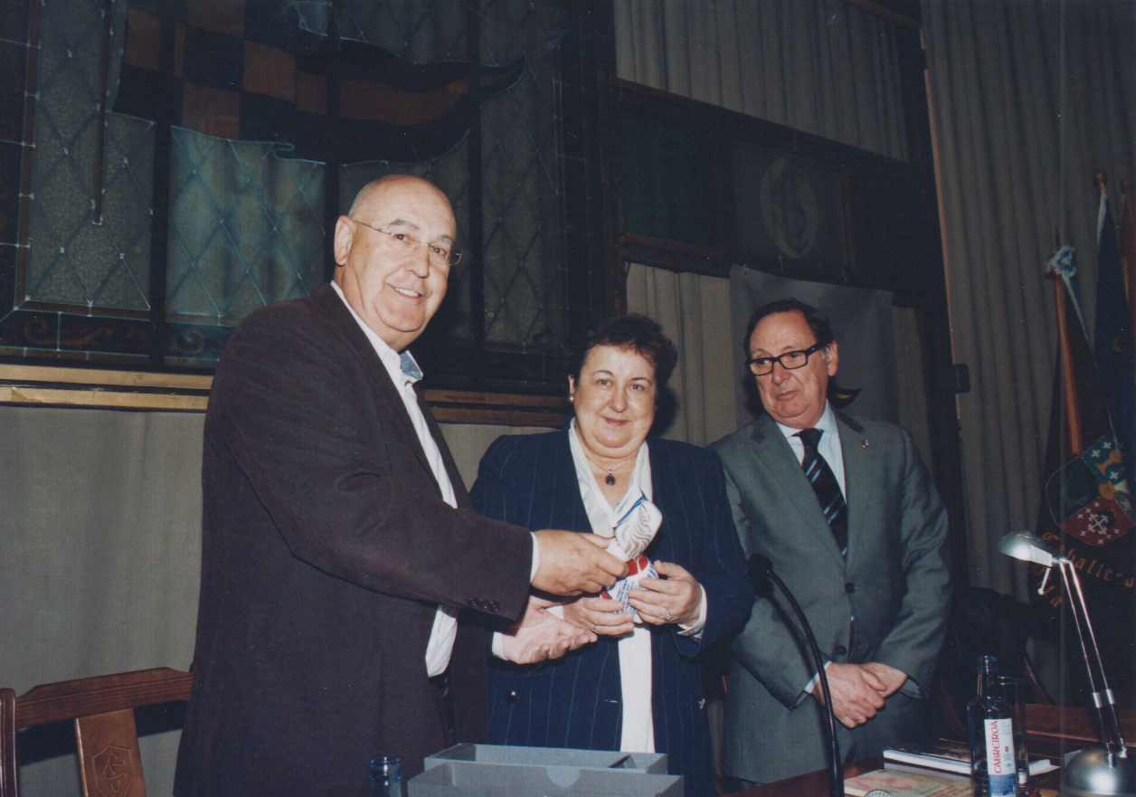 El Maestre Vilasánchez le agradece a la conferenciante su presencia en este foro y le entrega como recuerdo una figura de María Pita, de Sargadelos. |