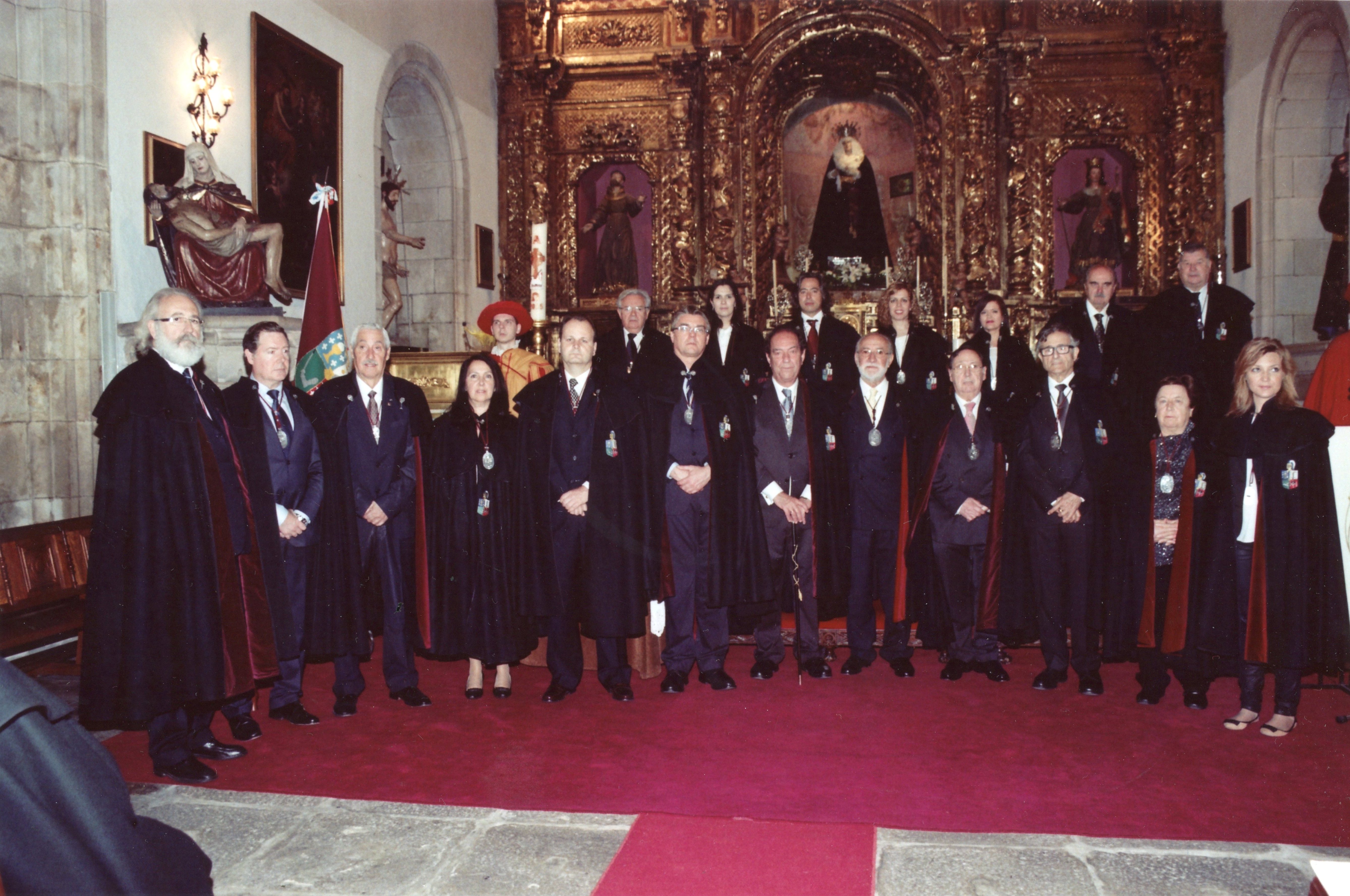 Los Caballeros ahora investidos, al fondo de la imagen, y la nueva Junta de Gobierno, en primera fila, acompañados por el Maestre de Honor Fundador, Antonio Gundin. |