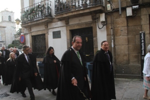 El Alcalde, Sr Ferreiro, el Caballero de Honor 2015, Sr. González Laxe, el Maestre, Sr. Mora, el Caballero de Honor 2008, Sr. Liaño, y el ex-Alcalde (y ex-Gran Maestre), Sr. Losada, antes de empezar el Acto. |